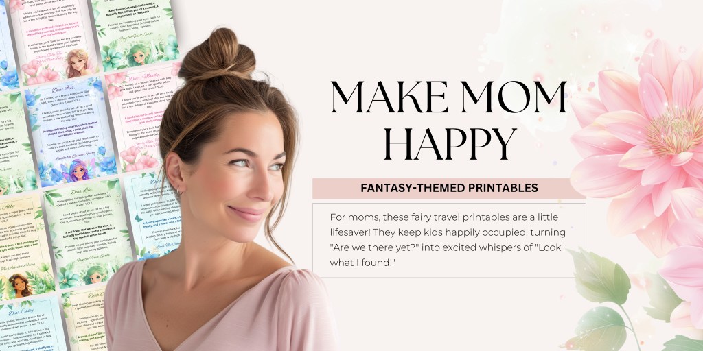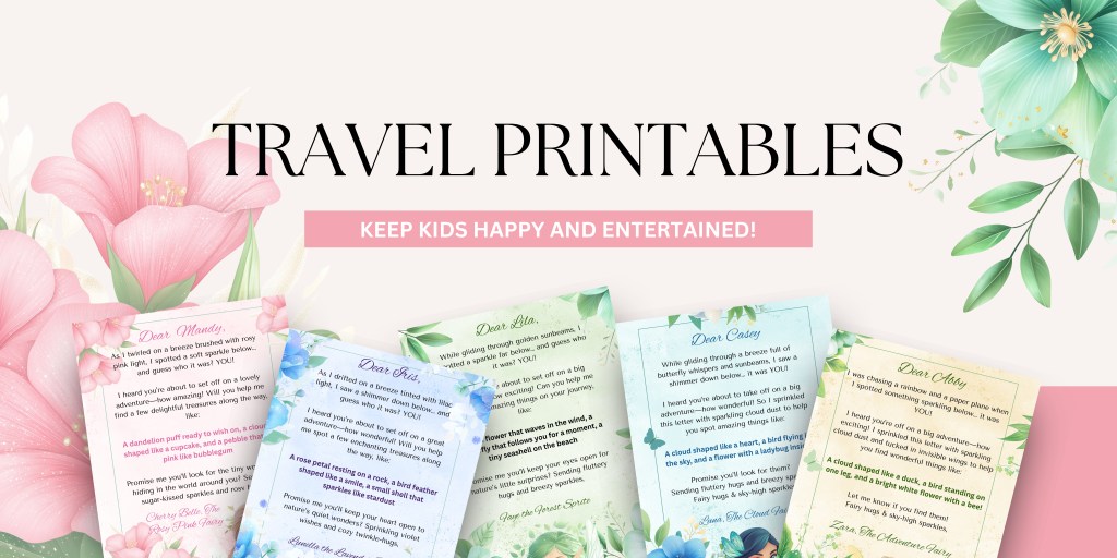 I’ve created a set of 5 fairy travel printables. Each one has its own unique adventure and whimsical tasks. These are designed to keep your child engaged. Whether you’re headed to grandma’s house or across the globe, these printables will turn travel jitters into joy.